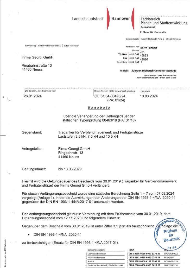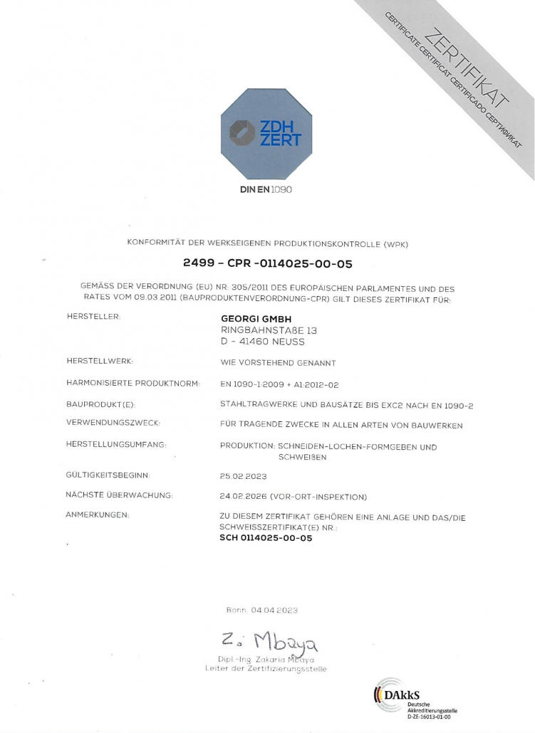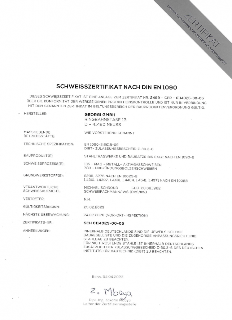 Unsere Zertifikate Werfen Sie einen blick in unsere Zertifikate. Bei fragen stehen wir gerne zur Verfügung. Kontakt Download Werkseigene Produktionskontrolle Download DIBT-Zulassung GK Tragankerkopf Download Typenprüfung 2024 Download Schweisszertifikat nach DIN EN 1090 Links:HomeLeistungenProdukteÜber UnsKarriereKontaktZertifikate RechtlichesImpressumDatenschutzCookiesAGBs KontaktGeorgi GmbHRingbahnstr. 1341460 NeussTel.: +49 2131 80245E-Mail: service@technik-georgi.de Designed byMertens Design